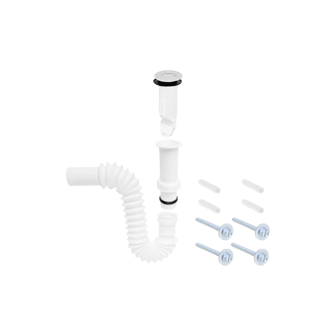 Incluye Kit de instalación: Llave ABS para lavabo, tubo tuerca p/lavabo con contra check anti-olores y cubierta de (acero inoxidable),acordeon triple sello de 55 cm y juegos de taquetes, c/rondanas y pijas