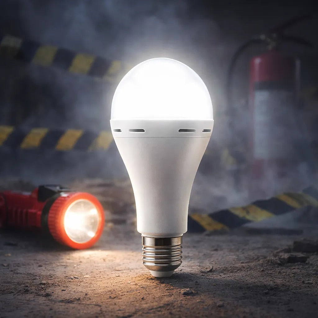 Foco LED recargable diseñado para emergencias, ideal para mantener iluminado por un determinado periodo de tiempo tus espacios claves del hogar, oficina y más lugares cuando falla la electricidad como en apagones, huracanes o tiempos de lluvia.