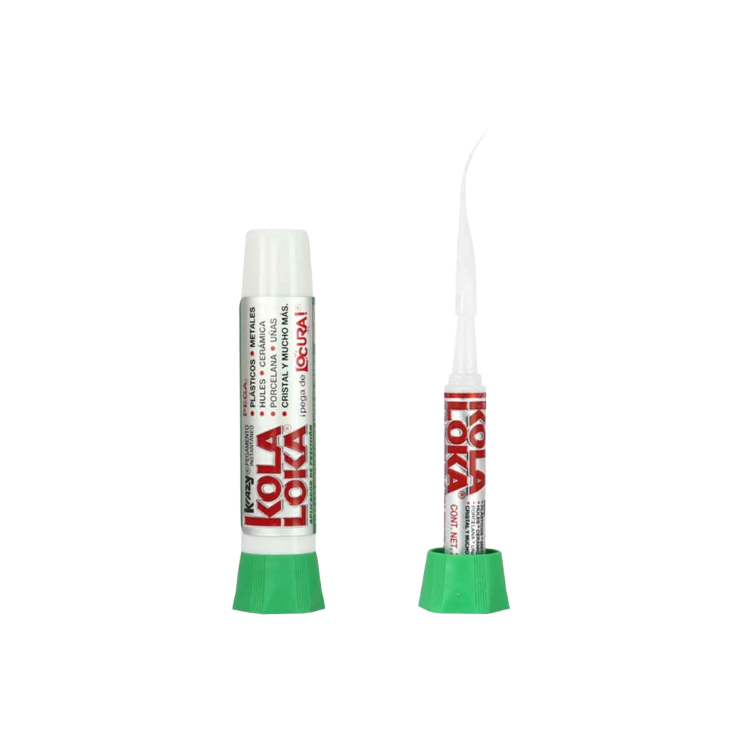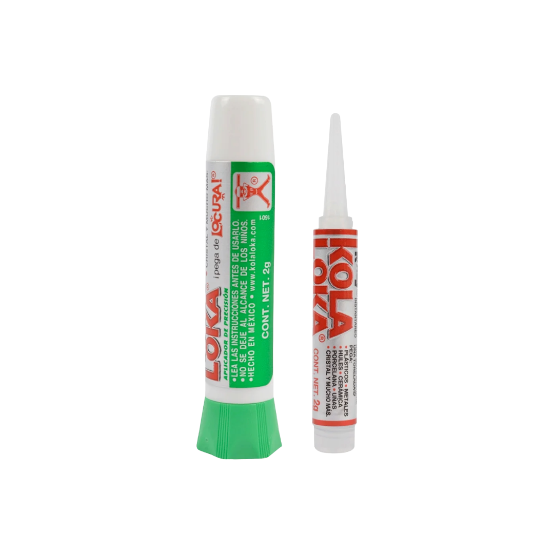 Kola Loka tradicional gotero de 2 grs pega en tan solo 5 segundos, su diseño con aplicador de precisión facilita la distribución del producto, evitando el contacto con el usuario, no deja manchas y puede ser usado en diferentes superficies como: plástico, metales, hules, porcelana, cerámica, cristal, algunas de sus aplicaciones son: en suelas de tenis, zapatos, sella tuercas y tornillos, topes de hule, molduras, techos de vinilo, tableros, reflectores, entre otros.