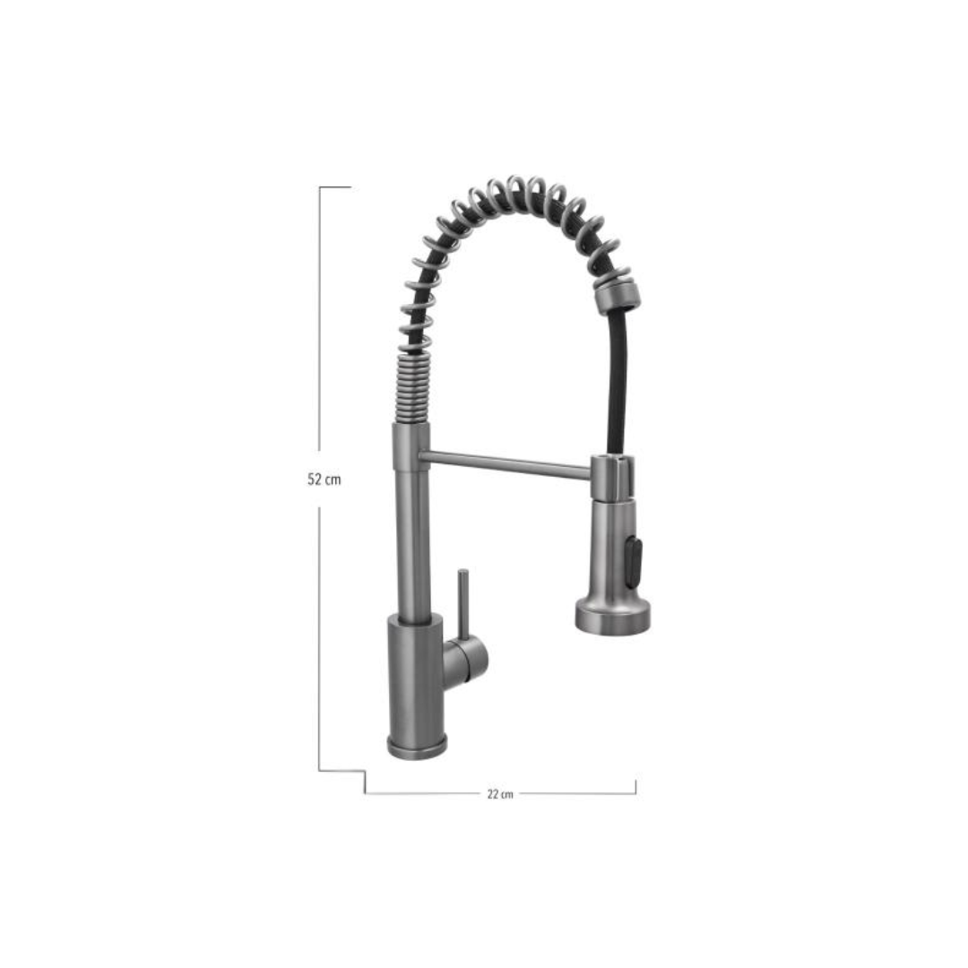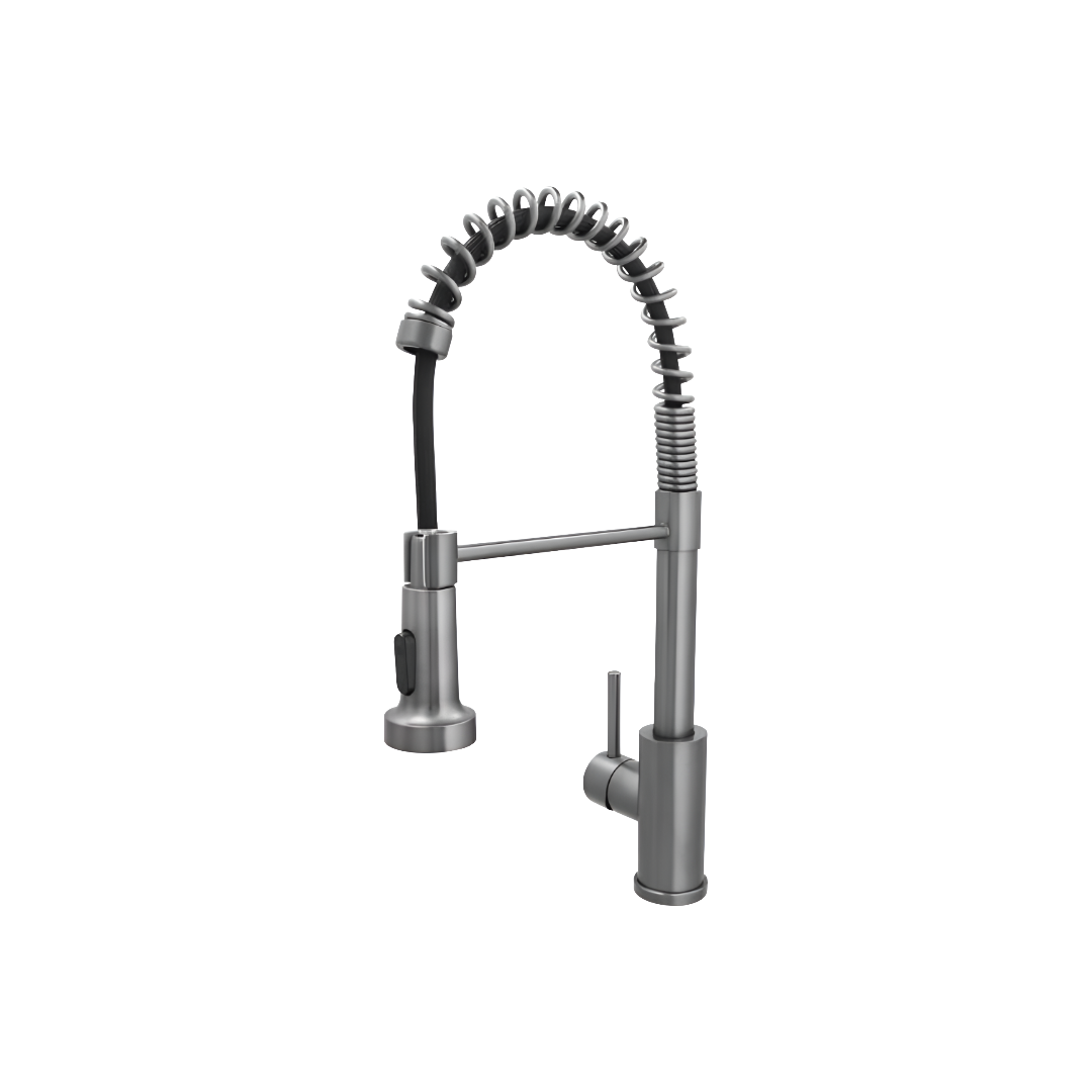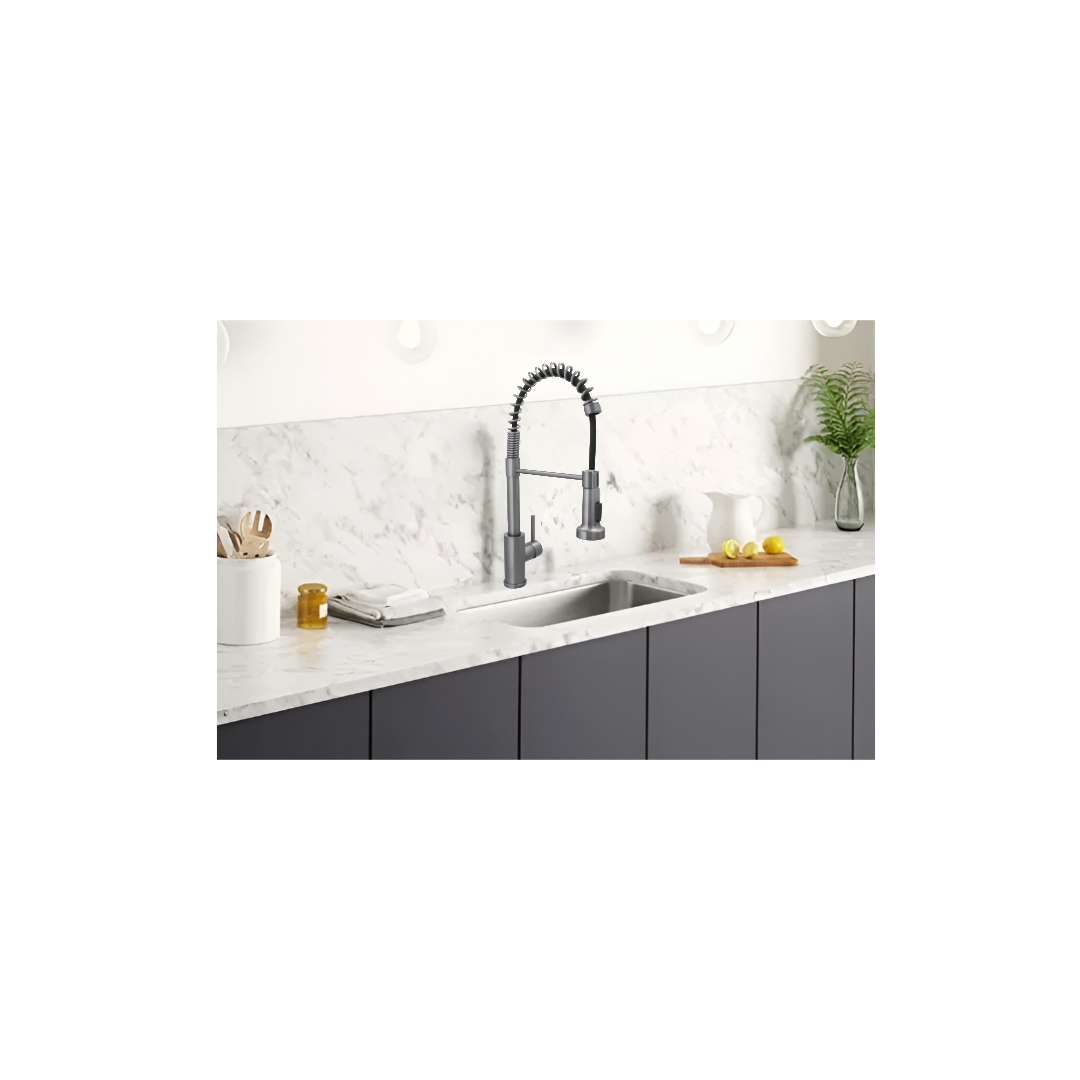 Monomando para cocina retráctil alto color grafito cuerpo de acero inoxidable con resorte pull down y 2 funciones salida de chorro y regadera, movible 360 grados, ideal para cualquier espacio en la cocina y nuevas tendencias
