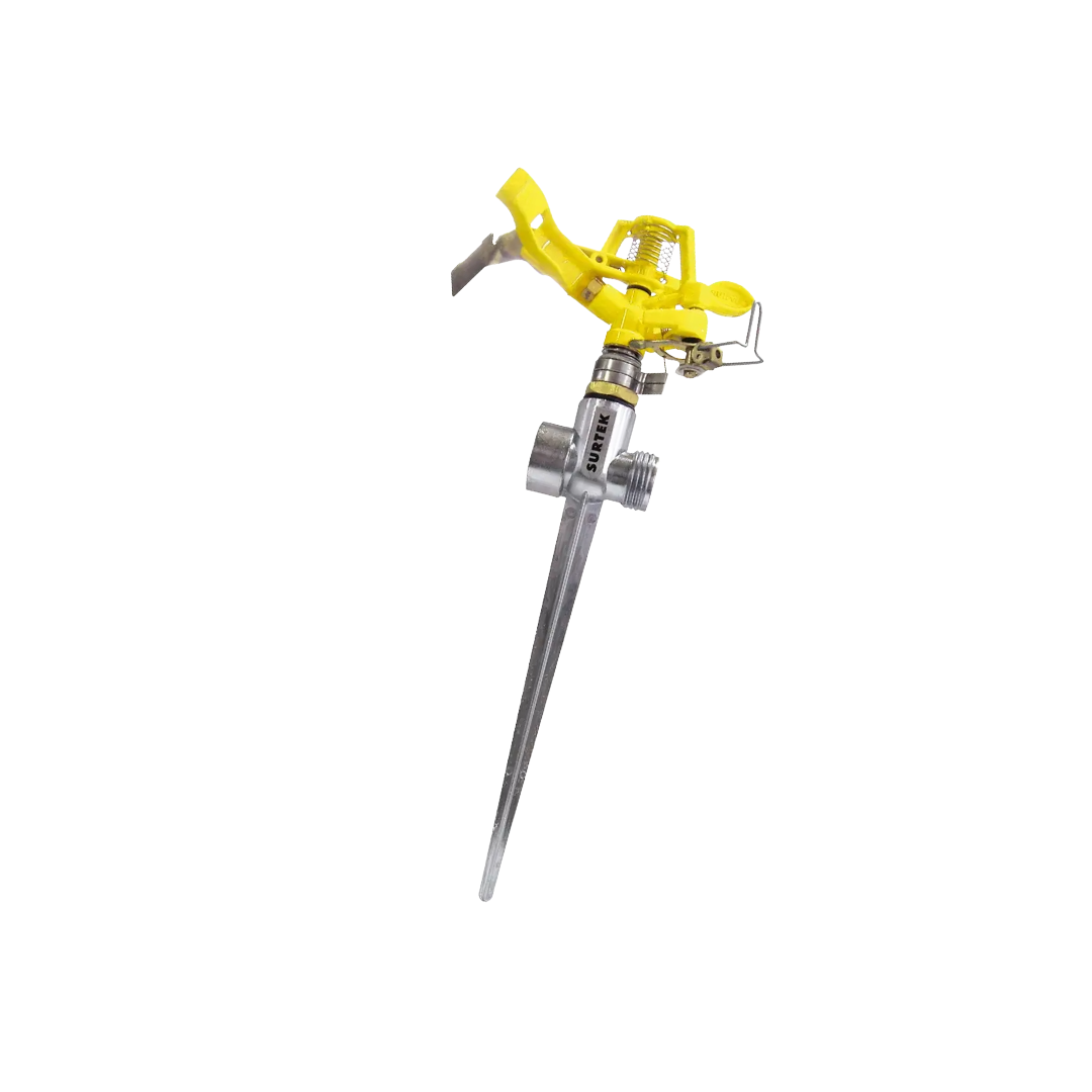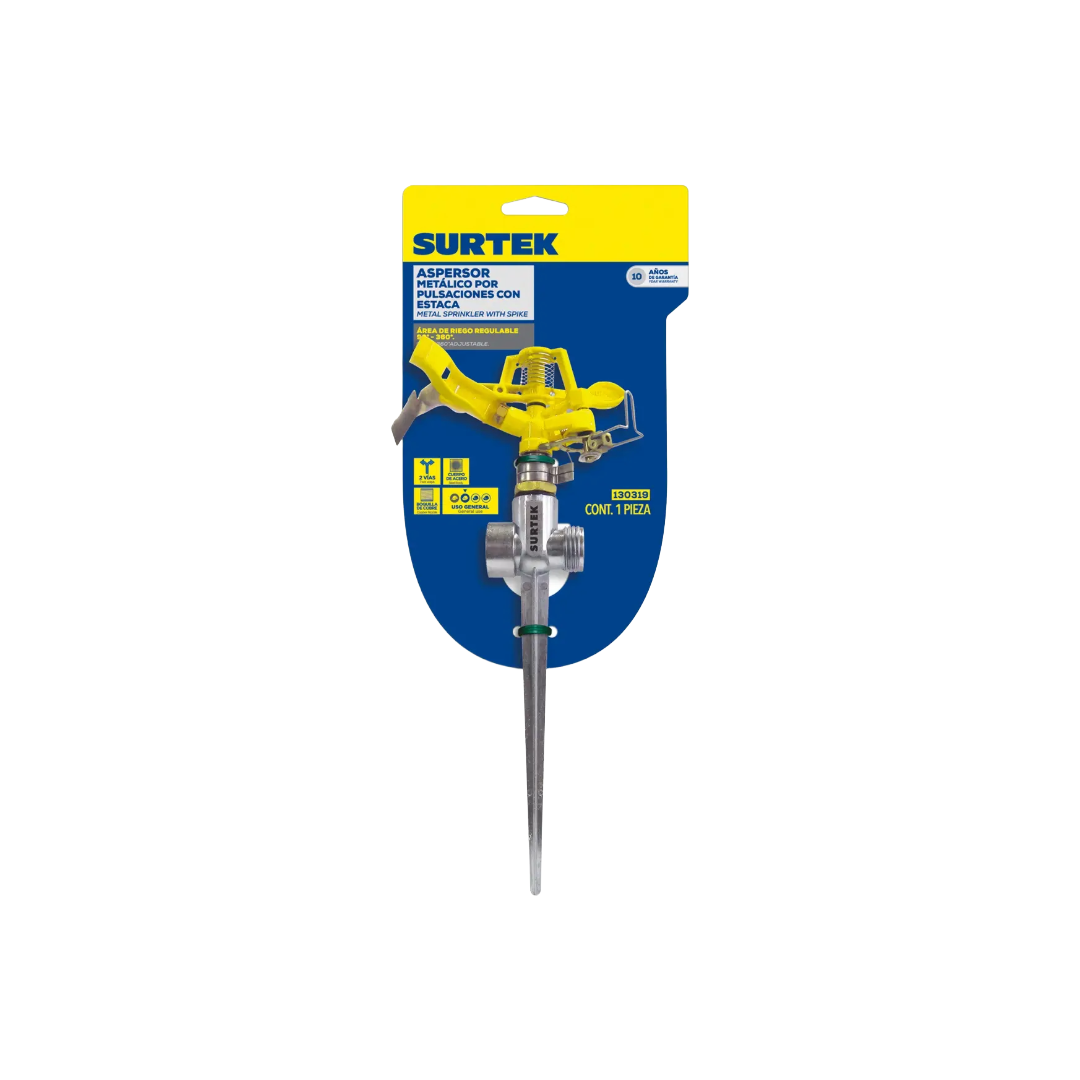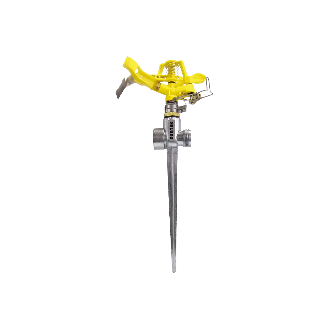 Aspersor metálico regulable por pulsaciones 2 vías, boquilla de cobre, clips y retenes ajustables para regular el área de riego.